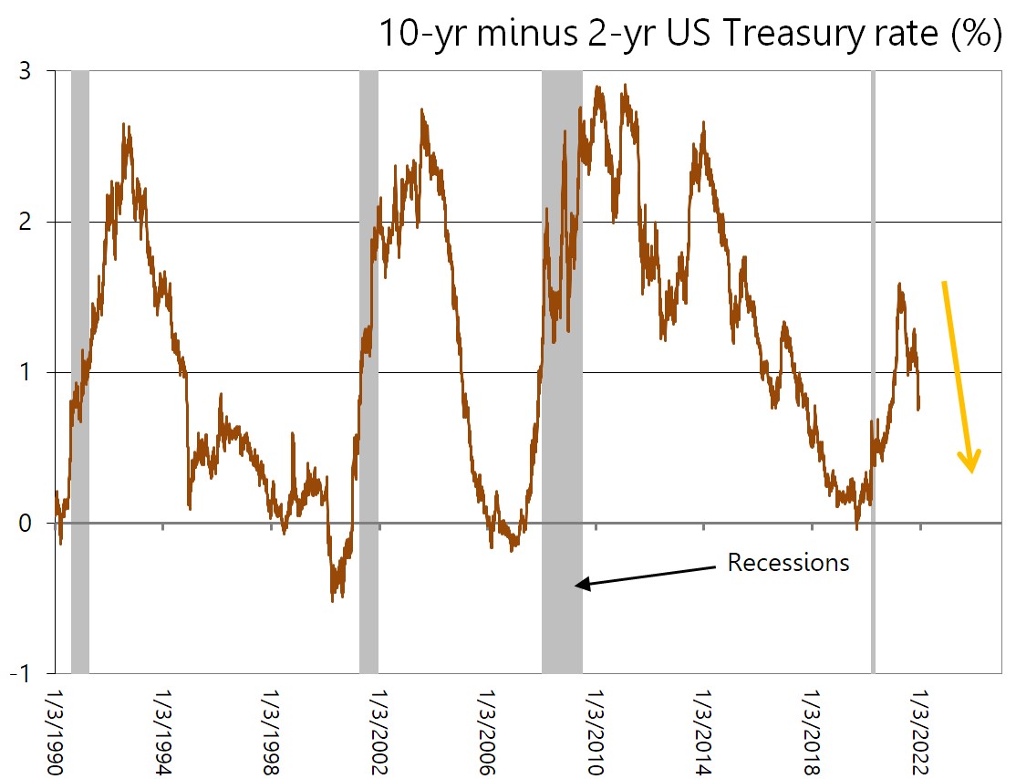 Second, the yield difference between the 10-year and the 2-year U.S. Treasury notes is less than 0.8%, half of what it was in the first quarter after narrowing quickly in the last few weeks. The reason why this is concerning is that this difference reflects the view of market participants about the economic outlook: The narrower it is, the weaker the prospects. The few occasions when it turned negative were followed a few quarters later by recessions. It is still far from being negative, but the rapid decline suggests that the market is quickly becoming convinced that the economy will slow down.