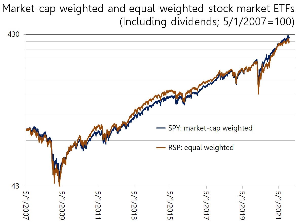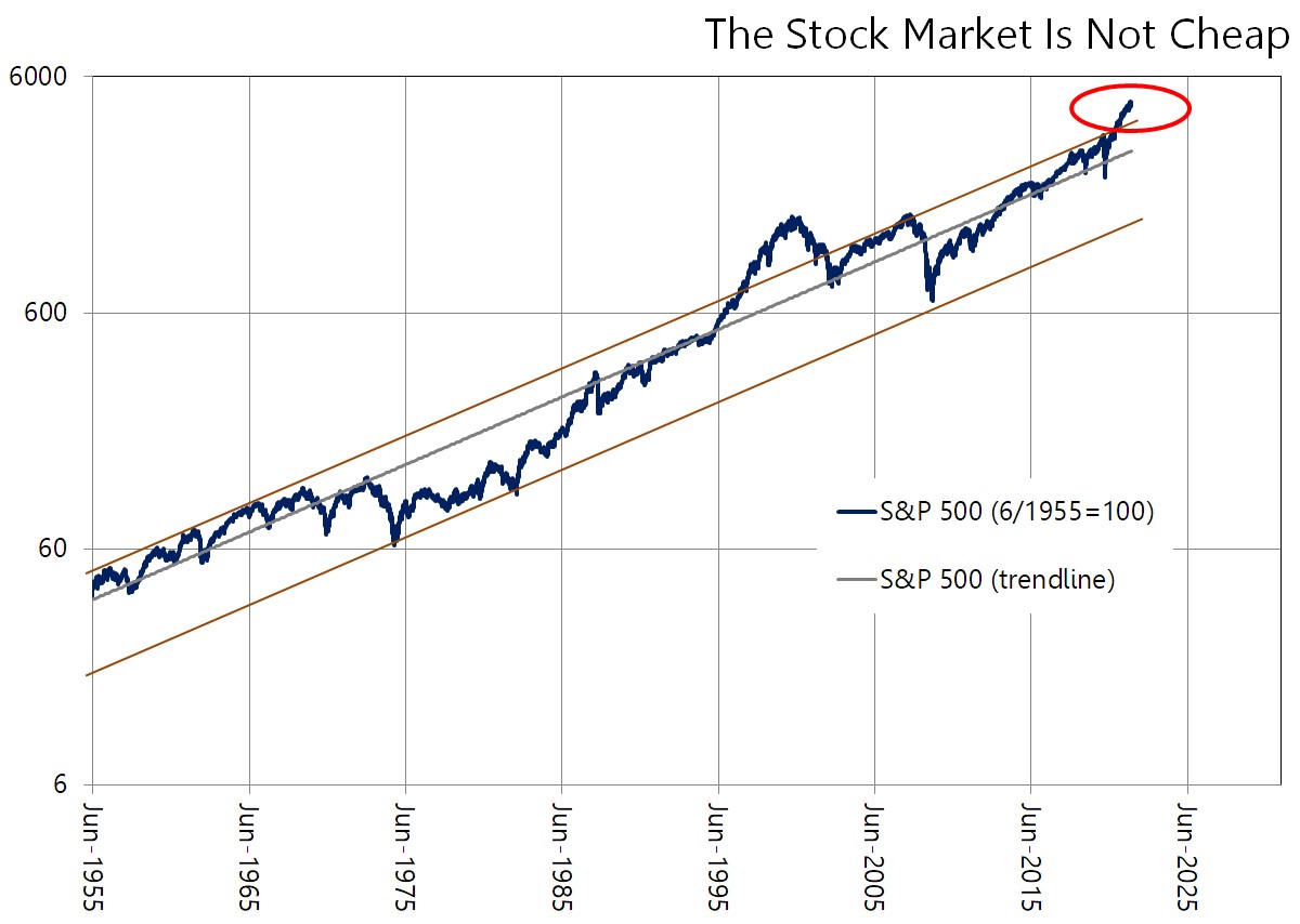 This argument does not really hold up. There is an index that assigns the same weight to every stock, large or small, in the S&P 500. While the market-cap index (the S&P 500) seems marginally ahead of the equal-weight index in recent months, it is hard to argue that the big-stock effect is really at play when the indices are plotted together. Either way you look at it, the equity market is at the top of its historical trend band.