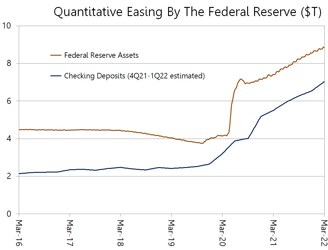 To be sure, nobody has a clear understanding about how reducing the Fed’s balance sheet could impact the economy. Fed Governor Christopher Waller is quoted in the Wall Street Journal as saying that they “have no economic theory of how large the central bank’s balance sheet should be.” One thing is clear, however: The total amount of money in private checking accounts is now three times larger than before the pandemic, and it is correlated to the size of the Fed’s balance sheet through the interactions between the Fed, the banks and the public.
