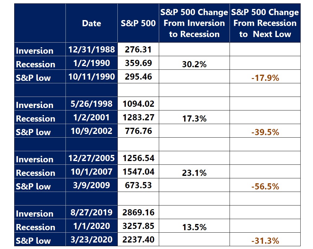 This outline aligns well with previous pre-recession experiences. The market rallied for a few months or quarters after the yield curve inverted and then was hit hard when the recession arrived.